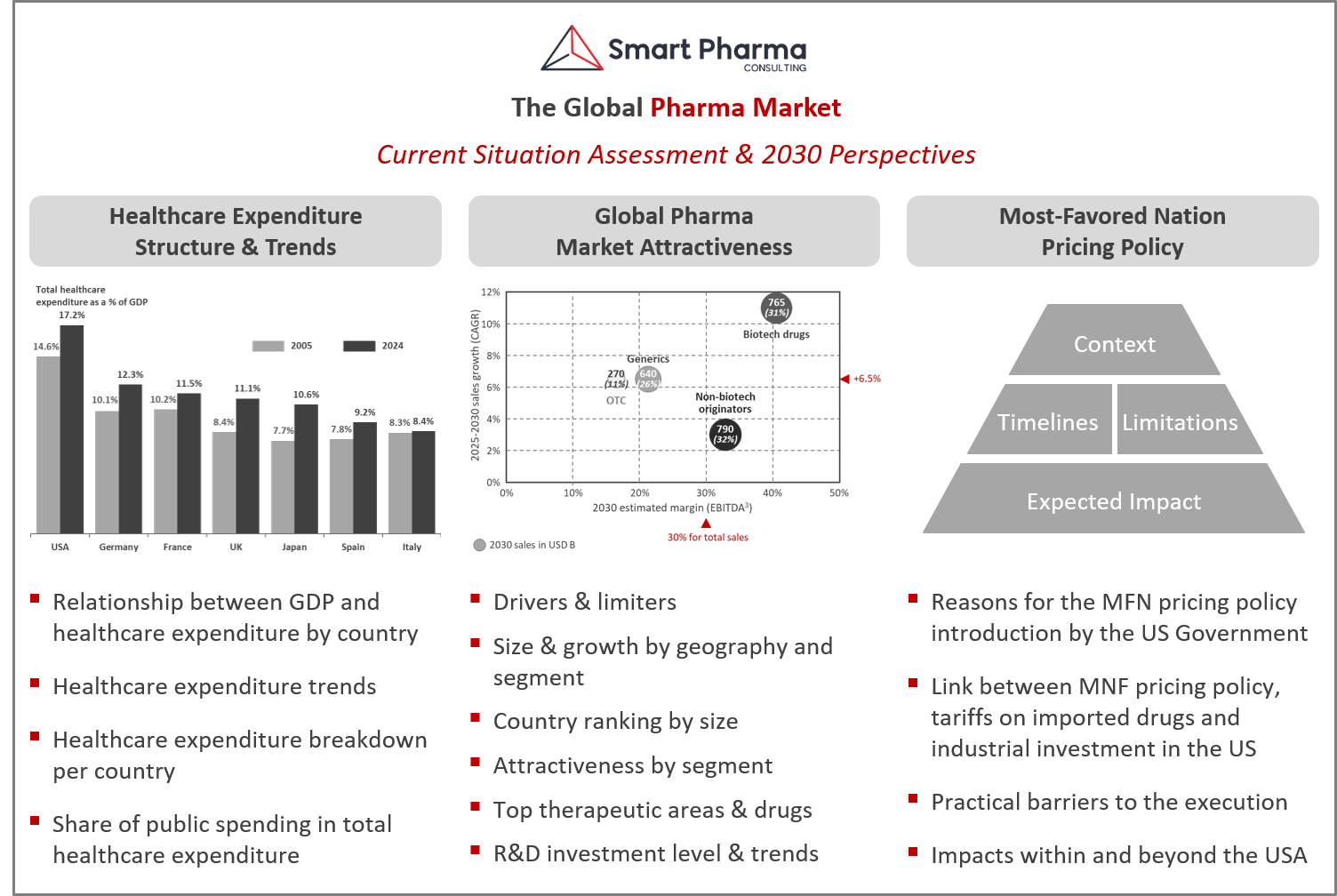 Based on the analysis of the most recent data and trends (gathered in The Global Pharma Market position paper), we estimate that over the 2025 – 2030 period the global pharma market should: