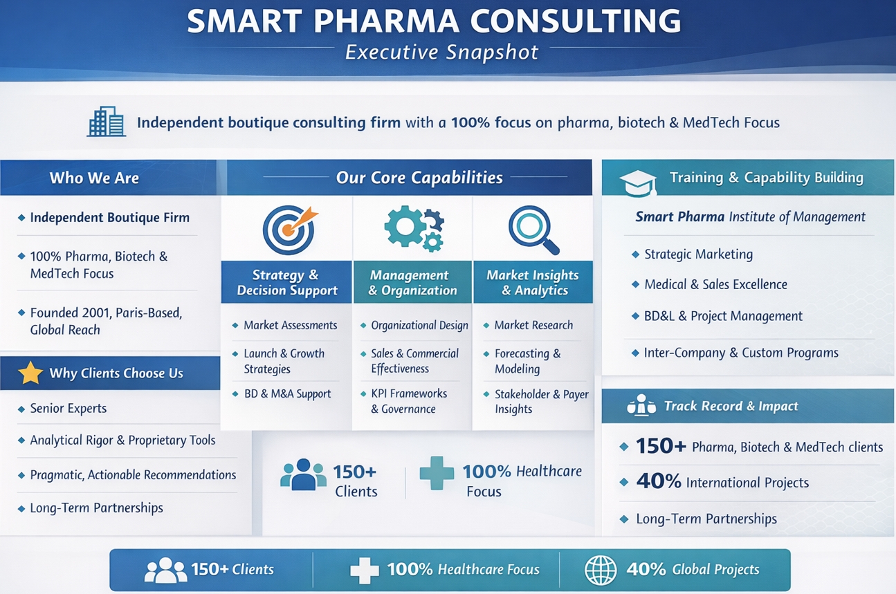 “Smart Pharma Consulting is known as a boutique yet influential consulting firm in the healthcare and pharma sector — combining strategic advisory services, practical training, rigorous research, and a commitment to both client value and broader societal impact” …